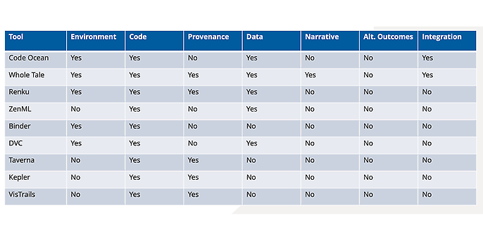 Comparison of tools used to support reproducible research methods, Source: ‘Traceability for trustworthy AI: A Review of Models and Tools’ by Marçal Mora-Cantallops.